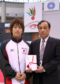 5月18日,日本選手上山容弘(左)代表東道主把募集到的捐款交給中國(guó)隊(duì)領(lǐng)隊(duì)、國(guó)家體育總局體操運(yùn)動(dòng)管理中心蹦床技巧部部長(zhǎng)趙嘉偉。當(dāng)日,蹦床世界杯日本站組委會(huì)為中國(guó)地震災(zāi)區(qū)募捐,各國(guó)運(yùn)動(dòng)員和很多日本觀眾紛紛獻(xiàn)上愛(ài)心。新華社記者:張華