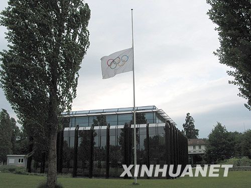 5月20日,瑞士洛桑國際奧委會(huì)總部前的五環(huán)旗降半旗向中國汶川大地震遇難者志哀。