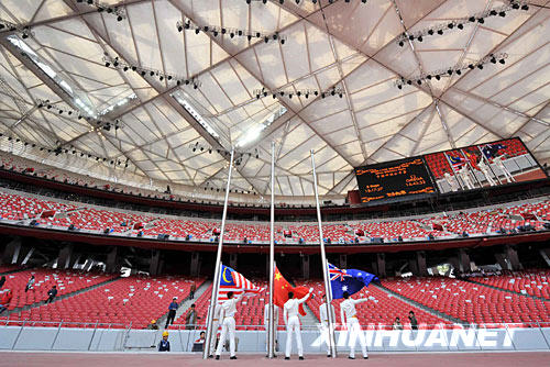 圖為旗手們在“鳥巢”內(nèi)進行升旗演練(5月18日攝)。