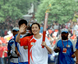 5月27日,最后一棒火炬手、前中國(guó)女排隊(duì)員孫玥在進(jìn)行傳遞。當(dāng)日,北京奧運(yùn)會(huì)圣火在江蘇南京傳遞。