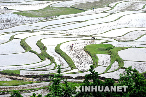 5月31日在貴陽(yáng)市花溪區(qū)高坡鄉(xiāng)拍攝的梯田美景。眼下,雨水充沛,高坡鄉(xiāng)的梯田分外迷人。