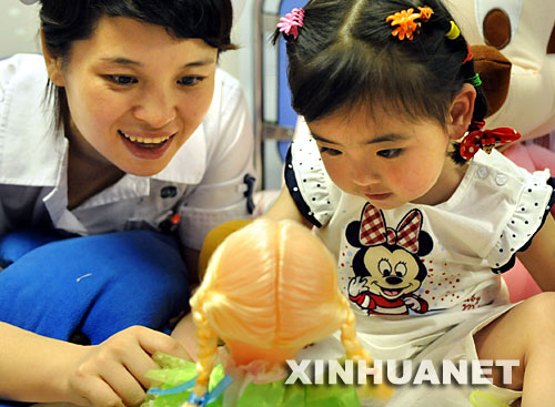 6月1日,病床上的宋馨懿在護(hù)士的陪伴下玩娃娃。