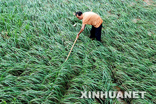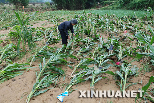 6月2日,在仙回瑤族鄉(xiāng)大中村,一名村民將受災(zāi)倒地的玉米扶起。 |
