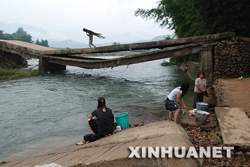 6月2日,在仙回瑤族鄉(xiāng)大中村,一名村民扛著木材從一座被洪水沖毀的橋上走過(guò)。 |