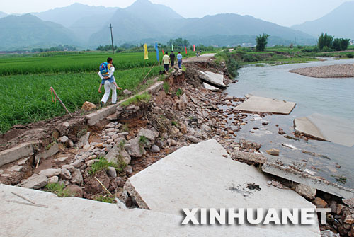 | 6月2日,在仙回瑤族鄉(xiāng)古盤村,村民小心通過(guò)被洪水沖毀的道路。 |
