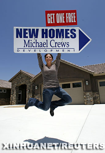 6月3日,在美國加利福尼亞一棟售價(jià)180萬美元的房子前,“邁克爾團(tuán)隊(duì)”房地產(chǎn)公司的一名工作人員跳躍著展示“買一套送一套”的廣告牌。