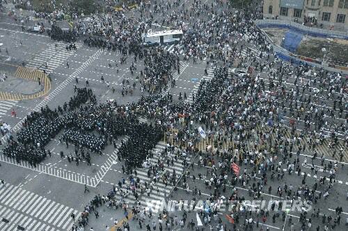 6月8日,韓國防暴警察在首爾街頭阻攔抗議民眾!⌒氯A社/路透