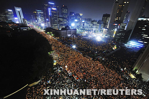 因擔憂進口美國牛肉可能給韓國帶來瘋牛病隱患,約100萬韓國人當天走上街頭參加抗議。韓國今年4月與美國達成開放市場進口美國牛肉協(xié)議,但遭到國內(nèi)強烈反對,引發(fā)一系列抗議活動。 新華社/路透
