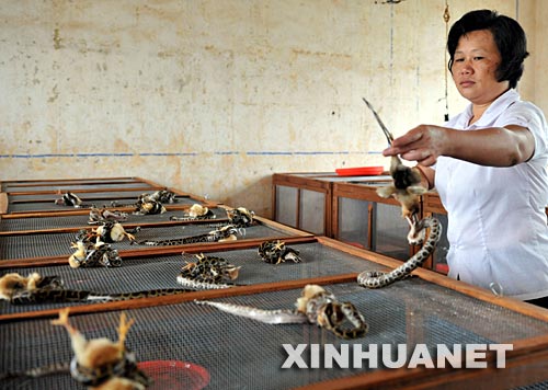 海南東盛弘公司的工人用小雞喂養(yǎng)人工孵化的小蟒蛇(6月7日攝)。 | |
