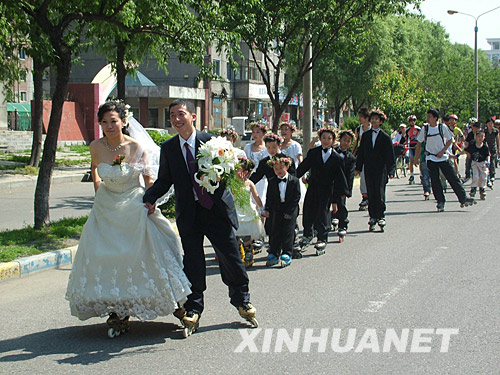 6月15日,黑龍江省牡丹江市的逯璐與哈爾濱姑娘王詩(shī)洋喜結(jié)良緣,倆人和親朋好友們穿著輪滑鞋,一起在街頭滑行。