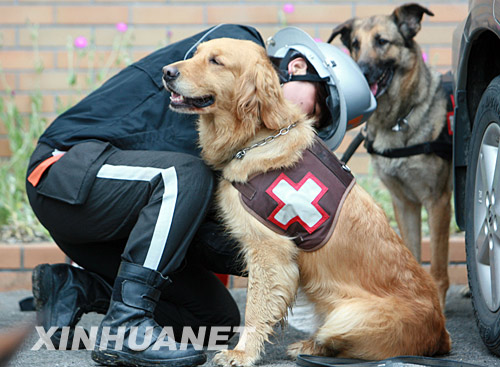 6月16日,在受災(zāi)嚴(yán)重的日本宮城縣栗原市花山村,一名救援人員為搜救犬做搜救前的準(zhǔn)備工作。