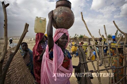 6月19日,在乍得東部的一個難民營,來自達(dá)爾富爾地區(qū)的幾名難民頂著罐子前往井中取水。
