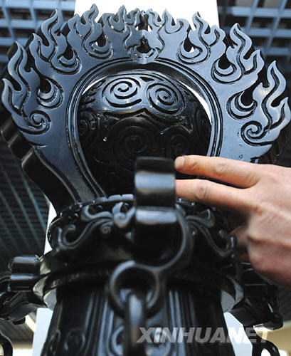 “中華吉祥”大型玉雕作品頂端雕飾有圣火、“祥云”寶珠等奧運元素(6月25日攝)。