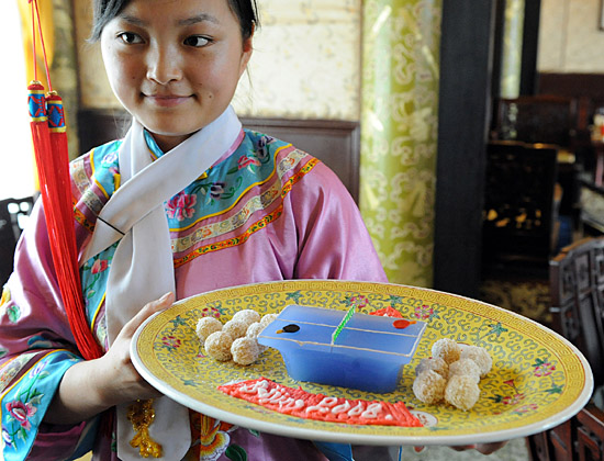 圖為身著清朝宮廷旗袍的北京聽鸝館飯莊服務(wù)員在展示體育造型菜品。