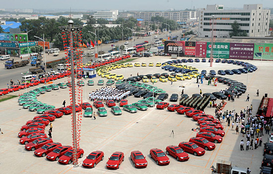 7月5日,沈陽市啟動(dòng)“志愿服務(wù)迎奧運(yùn),文明出行我先行”主題活動(dòng),150多輛不同品牌、五種顏色拼成奧運(yùn)五環(huán)圖案的宣傳車停在沈陽街頭,宣傳文明出行。