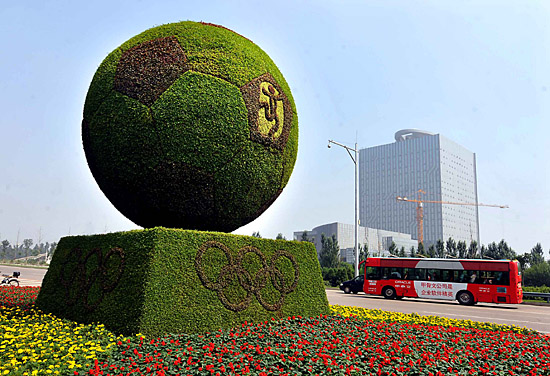 [進(jìn)入北京奧運(yùn)會(huì)專(zhuān)題] 沈陽(yáng)奧體中心附近的一條街道上,矗立著一個(gè)以足球?yàn)樵煨偷幕ɑ艿袼。隨著奧運(yùn)會(huì)開(kāi)幕日期臨近,在北京奧運(yùn)會(huì)分賽場(chǎng)之一的沈陽(yáng)市,無(wú)論是城區(qū)還是旅游景點(diǎn),到處都能感受到濃郁的奧運(yùn)氛圍。
