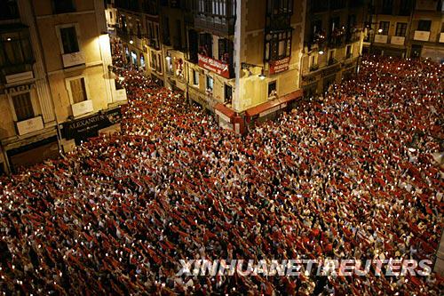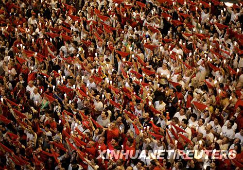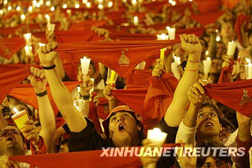 7月15日凌晨,在西班牙北部城市潘普洛納,節(jié)日狂歡者手舉蠟燭和紅絲巾參加圣·費(fèi)爾明節(jié)的閉幕活動。新華社/路透 | |