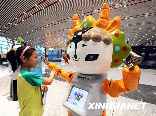 當(dāng)日,在民航局及機場奧運團(tuán)隊支持下,由中國民航大學(xué)研制的5個奧運福娃機器人,亮相北京首都國際機場T3航站樓。奧運會期間,奧運福娃機器人將守候在北京首都國際機場,迎送到港離港的奧運大家庭成員和國內(nèi)外賓客。