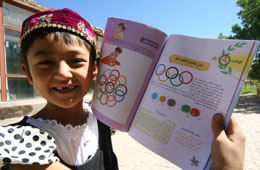 新疆哈密市天山鄉(xiāng)的少數(shù)民族小學(xué)生在展示剛領(lǐng)的《北京奧運會小學(xué)生讀本》。
