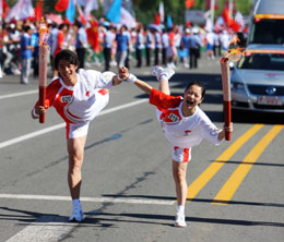 7月13日,火炬手徐銘(左)與火炬手方丹在交接后慶祝。當(dāng)日,北京奧運火炬在黑龍江省齊齊哈爾市傳遞。