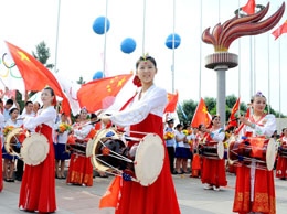 7月14日,演員們在起跑儀式現(xiàn)場進行表演。當(dāng)日,北京奧運圣火在吉林省長春市傳遞。