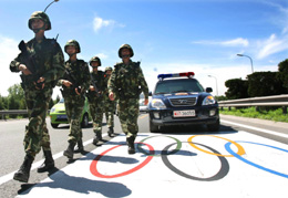 7月12日,奧運專用道武裝處突車組出征儀式在北京舉行,39輛嶄新的防彈車正式上路執(zhí)勤,擔(dān)負奧運會專用道路的巡邏、處理突發(fā)事件、反恐任務(wù)。