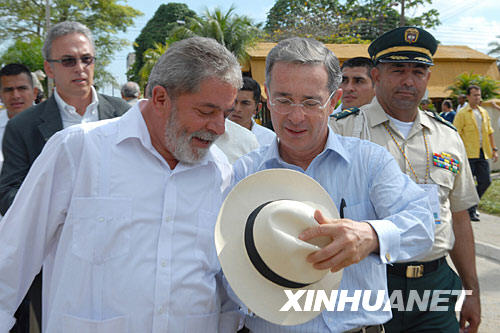 7月20日,在哥倫比亞萊蒂西亞,哥總統(tǒng)烏里韋(前右)和巴西總統(tǒng)盧拉(前左)共同出席慶;顒。當(dāng)天,哥倫比亞舉行閱兵等活動,慶祝獨立198周年。哥總統(tǒng)烏里韋主持閱兵儀式,巴西總統(tǒng)盧拉、秘魯總統(tǒng)加西亞應(yīng)邀出席。