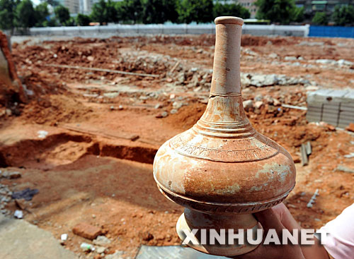 7月21日,考古工作者在展示出土的東漢細(xì)頸瓶。