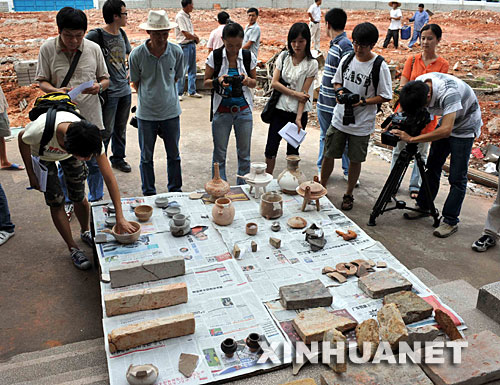 7月21日,記者們?cè)趨⒂^出土的隨葬器物。