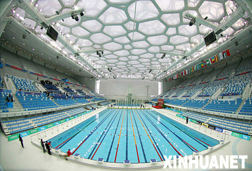 在奧林匹克公園景觀大道西側(cè),國(guó)家游泳中心像一座藍(lán)色的水晶宮殿,無(wú)論在陽(yáng)光下,還是在燈光下都透射著夢(mèng)幻般的色彩。藍(lán)天白云的映襯下,淡藍(lán)色的泡泡似乎融在了一片蔚藍(lán)的海洋中,水的神韻得到完美體現(xiàn),與位于其東側(cè)的“鳥(niǎo)巢”—國(guó)家體育場(chǎng)的陽(yáng)剛雄渾之美相對(duì),“水立方”展示的是以水為主題的陰柔與秀美。 作為世界上唯一一個(gè)完全由膜結(jié)構(gòu)來(lái)進(jìn)行全封閉的公共建筑,她晶瑩剔透的“方形”水泡營(yíng)造出一種輕靈、寧?kù)o、具有詩(shī)意的氛圍,讓觀眾流連忘返。“水立方”與“鳥(niǎo)巢”。一方一圓,一陽(yáng)剛一柔美,把奧林匹克公園主場(chǎng)區(qū)的氣氛烘托到了極致。 比賽項(xiàng)目