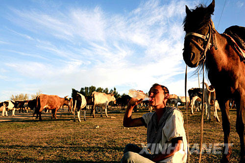 7月23日,新疆阿勒泰市阿葦灘鎮(zhèn)庫布西村牧民在一塊因干旱日漸退化的草場(chǎng)上放牧。新疆今年遭遇自1974年以來最為嚴(yán)重的旱災(zāi),全疆大部分地區(qū)春夏連旱已成定局,造成農(nóng)作物大面積絕收,2.8億畝草場(chǎng)干旱,畜牧業(yè)受災(zāi)嚴(yán)重。在旱情最為嚴(yán)重的塔城、阿勒泰兩地,受旱草場(chǎng)面積占到可利用草場(chǎng)面積的60%。 |