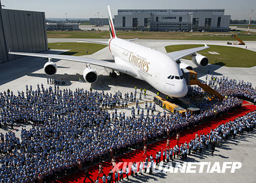 7月28日,在德國(guó)漢堡附近的芬肯韋德,空中客車公司的員工參加交付儀式。 新華社/法新