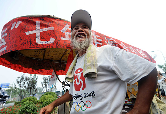 自2001年11月,現(xiàn)年53歲的陳冠明開始騎三輪車從徐州到北京的旅途,他不僅向沿途群眾宣傳“綠色奧運”等理念,還身體力行地撿拾垃圾,用積極的行動實踐自己的“綠色奧運夢”。