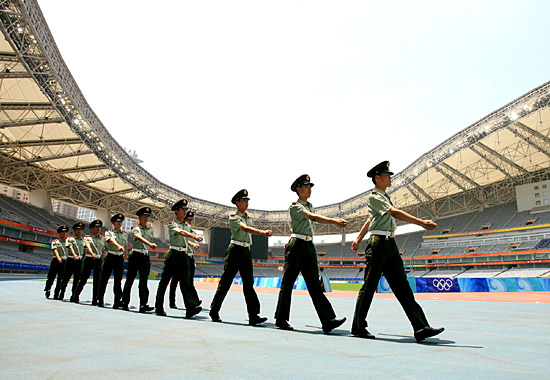 武警上?傟(duì)一支隊(duì)官兵目前已全面進(jìn)駐北京奧運(yùn)會(huì)上海賽區(qū)的比賽場(chǎng)館——上海體育場(chǎng),對(duì)比賽場(chǎng)館和周邊相關(guān)區(qū)域?qū)嵭蟹忾]式管理。
