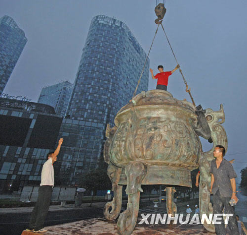 7月31日早晨,工人在北京東直門立交橋頭吊裝簋街新地標“伯簋”。