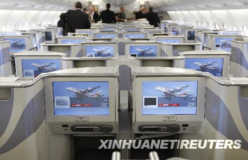 8月1日,在美國(guó)紐約肯尼迪國(guó)際機(jī)場(chǎng),人們站在首航的阿聯(lián)酋航空公司的空中客車A380客機(jī)商務(wù)艙內(nèi)。新華社/路透