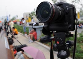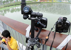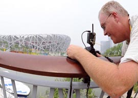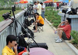 8月8日,眾多攝影記者提前在國家體育場——“鳥巢”南側(cè)架好攝影器材,為晚上的開幕式做準備。此刻距北京奧運會開幕還有不到6個小時。