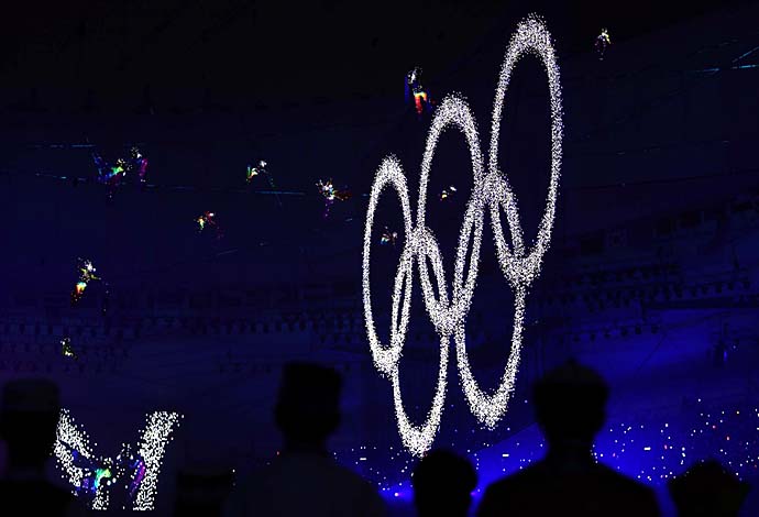 8月8日,第29屆夏季奧林匹克運(yùn)動(dòng)會(huì)在國家體育場——“鳥巢”隆重開幕。這是開幕式上閃閃發(fā)光的夢幻“五環(huán)”。