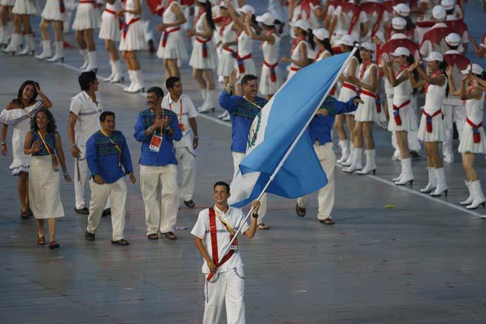 8月8日晚8時,第29屆夏季奧林匹克運動會在國家體育場——“鳥巢”隆重開幕。這是危地馬拉代表團在開幕式上入場。