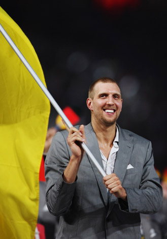 8月8日晚8時,第29屆夏季奧林匹克運動會在國家體育場——“鳥巢”隆重開幕。這是德國代表團旗手諾維茨基在開幕式上入場。