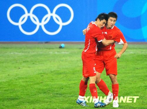 8月7日,中國(guó)國(guó)奧隊(duì)球員李瑋峰(左)與隊(duì)友董方卓一同慶祝進(jìn)球。當(dāng)日,在沈陽(yáng)進(jìn)行的北京奧運(yùn)會(huì)男子足球C組的比賽中,中國(guó)國(guó)奧隊(duì)以1比1戰(zhàn)平新西蘭國(guó)奧隊(duì)。新華社記者