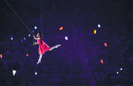 在北京奧運(yùn)會(huì)的開幕式上,一個(gè)小女孩兒的出現(xiàn)讓整場演出增添了童趣和浪漫。她就是那個(gè)放著風(fēng)箏從“星星鳥巢”上空緩緩飛過的小姑娘朱巧妍。 即將在這個(gè)月過9歲生日的小巧妍在雜技界也算是一員“老將”了,來自安徽淮南的小女孩兒5歲便來到沈陽軍區(qū)雜技團(tuán)學(xué)習(xí)。正是這四年的學(xué)習(xí)生涯為她在“鳥巢”上空自然、淡定的表演奠定了基礎(chǔ)。 其實(shí)小巧妍第一次被吊到半空的時(shí)候也害怕,那是因?yàn)樵谘莩鲋,她手中的“風(fēng)箏”和她自己是分別被固定在兩個(gè)不同的點(diǎn)上的,有的時(shí)候兩個(gè)“點(diǎn)”走起來不同步,她幼小的身體就會(huì)被慣性拽得搖搖晃晃,雖然保護(hù)措施非常嚴(yán)密,不會(huì)出現(xiàn)危險(xiǎn),但在空中晃來晃去,別說是一個(gè)小女孩兒,就是一個(gè)大人也受不了。 小巧妍非?斓鼐瓦m應(yīng)了這種高空表演,再第一次被吊到半空,稍微調(diào)整了心情之后,小巧妍居然還調(diào)皮地翻起了跟頭,這可讓創(chuàng)意團(tuán)隊(duì)的叔叔阿姨們跌破了眼鏡,這個(gè)角色非她莫屬啊。第一次訓(xùn)練,短短10分鐘,小巧妍征服了所有人,完成了一個(gè)成年人或許苦練很長時(shí)間才能完成的任務(wù)。 在張藝謀的設(shè)想中,這個(gè)小女孩兒的出場一定要親切、自然、生活化,不能有表演的痕跡,小巧妍在叔叔阿姨們耐心地輔導(dǎo)下,終于放下了心理包袱,將這段演出完全當(dāng)成了一次游戲,正是這樣,這場演出才達(dá)到了預(yù)期的效果。 小巧妍很樂觀,雖然皮膚被曬得黑黑的,但她在排練期間從來不說苦,不說累,在排練場,小巧妍也給其他演員帶來了歡樂,每次她回到地面,總會(huì)有其他的叔叔阿姨過來跟她一起玩兒,跟她合影。為了保護(hù)小巧妍稚嫩的身體,開幕式空中特技表演總設(shè)計(jì)程小東親自出馬,為小巧妍量身設(shè)計(jì)了一套舒適、貼身的防護(hù)裝備,這樣,鋼絲就不會(huì)勒傷這位大家心目中的小天使。 小巧妍也許是唯一一個(gè)能從空中“星星鳥巢”的演員了,她告訴我們,地上的“鳥巢”很美。