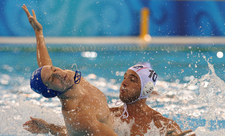 8月10日,在北京奧運(yùn)會男子水球預(yù)賽中,西班牙男子水球隊(duì)迎戰(zhàn)加拿大男隊(duì),西班牙隊(duì)球員費(fèi)利佩·佩羅內(nèi)(右)和加拿大隊(duì)球員康斯坦丁·庫達(dá)巴 在水中“優(yōu)雅”地拼搶,宛如陶醉共舞,讓人莞爾。