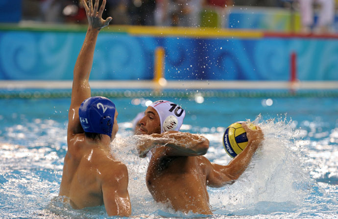 8月10日,西班牙隊球員費利佩·佩羅內(nèi)(右)在比賽中射門。當(dāng)日,北京奧運會水球比賽在奧體中心英東游泳館拉開帷幕,首場比賽西班牙隊以16比6戰(zhàn)勝加拿大隊。