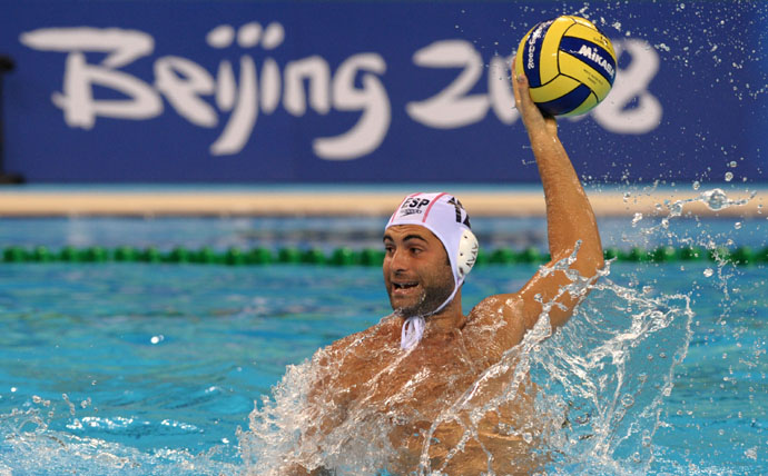 8月10日,西班牙隊球員哈維爾·加西亞在比賽射門。當日,北京奧運會水球比賽在奧體中心英東游泳館拉開帷幕,首場比賽西班牙隊以16比6戰(zhàn)勝加拿大隊。