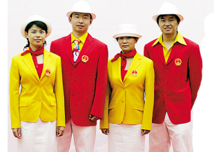 中國(guó)運(yùn)動(dòng)員的禮儀裝備采用傳統(tǒng)的“紅黃配”,男裝以紅上裝配黃襯衫,奧運(yùn)五環(huán)領(lǐng)帶;女裝以黃上裝配紅吊帶,祥云絲巾;下裝、禮帽、腰帶及禮儀鞋則均以白色為主。技術(shù)官員上裝及下裝的顏色以藏蘭色為主色調(diào),內(nèi)配白色襯衫。