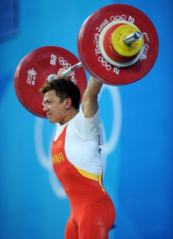 8月11日,中國選手張湘祥在比賽中。當日,張湘祥在北京奧運會舉重男子62公斤級決賽中獲得金牌。