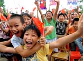 8月11日,幾名“盛裝”的外國觀眾在順義水上公園為皮劃艇激流回旋選手加油助威。