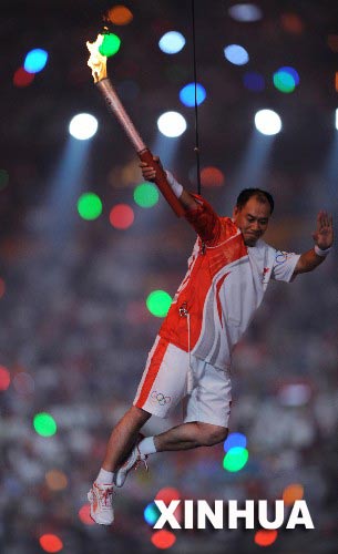 8月8日,第29屆夏季奧林匹克運動會在國家體育場隆重開幕。這是中國前體操名將李寧手持主火炬。 新華社記者 羅曉光