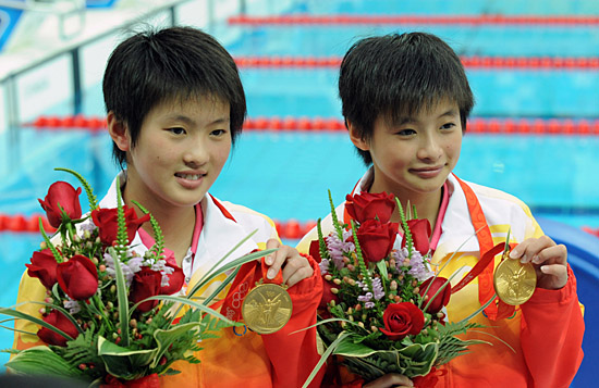 除了“完美”,你幾乎找不到更好的詞匯,來(lái)描繪12日王鑫和陳若琳的表現(xiàn)。 16歲的青春年華,“水立方”的夢(mèng)幻空間,第一枚奧運(yùn)金牌的滋味,以及毫無(wú)瑕疵的奪金過(guò)程,這一切,都太過(guò)美妙。 在“水立方”,開(kāi)闊的空間,供她倆似小燕自由翻飛,碧藍(lán)的水池,供她倆如小鴨優(yōu)雅嬉戲。1萬(wàn)多名觀眾匯聚起來(lái)的掌聲和吶喊,全部獻(xiàn)給這兩位10米高臺(tái)上的天使。 就在前一天,王鑫剛剛度過(guò)16周歲的生日。比賽結(jié)束后,王鑫的小臉燦若桃花,她說(shuō):“這枚金牌,是我16年來(lái)得到的最珍貴的生日禮物。獲得奧運(yùn)會(huì)金牌,也當(dāng)然是我一直以來(lái)的愿望。” 比王鑫小4個(gè)月零一天的陳若琳則說(shuō):“其實(shí)我們和國(guó)外選手的實(shí)力都差不多,主要要靠平時(shí)苦練! 讓我們重溫這對(duì)中國(guó)“小丫”完美摘金的過(guò)程: 北京奧運(yùn)會(huì)女子雙人10米跳臺(tái)決賽于14時(shí)30分開(kāi)始。在8對(duì)參賽選手中,王鑫/陳若琳第五個(gè)出場(chǎng)。她倆的動(dòng)作難度系數(shù)為13.6,僅列第四,但了解她們的人都知道,這并不是問(wèn)題?∏蝺(yōu)美的空中姿態(tài),形同一人的默契配合,微弱細(xì)小的入水水花,才是她倆的制勝武器。 第一跳,55.80分,名列第一,其中一名同步分裁判給出了10分; 第二跳,55.20分,再列第一,其中一名技術(shù)分裁判給出了10分; 接下來(lái)的三個(gè)動(dòng)作,同樣無(wú)懈可擊,同樣得到最高分。最終,王鑫/陳若琳以363.54分的總成績(jī)高居榜首,比第二名高出了28.38分。 王鑫/陳若琳獲得的這枚金牌,也延續(xù)了中國(guó)跳水“夢(mèng)之隊(duì)”在女雙10米跳臺(tái)這個(gè)項(xiàng)目上的輝煌。悉尼奧運(yùn)會(huì)上是李娜/桑雪,雅典奧運(yùn)會(huì)上是李婷/勞麗詩(shī),自雙人跳水項(xiàng)目于2000年進(jìn)入奧運(yùn)會(huì)以來(lái),中國(guó)隊(duì)從未讓女雙10米跳臺(tái)這枚金牌旁落。 第一次參加奧運(yùn)會(huì),為何能在比賽中表現(xiàn)得如此冷靜呢?王鑫說(shuō):“訓(xùn)練時(shí)教練讓我們放松,其實(shí)沒(méi)必要把奧運(yùn)會(huì)看得太過(guò)重要,我們需要做的就是放平心態(tài),放松地去跳! 王鑫告訴記者,11日是生日,自己并沒(méi)搞什么慶祝活動(dòng),也沒(méi)許什么愿,但還是收到了隊(duì)友們送的很多禮物,有衣服、項(xiàng)鏈等等。記者問(wèn):“陳若琳送了什么?”王鑫答:“她送給我友誼。” 對(duì)于奪冠的秘訣,有些靦腆的陳若琳說(shuō):“我們并沒(méi)有什么特別的心理訓(xùn)練,只是把平常的訓(xùn)練當(dāng)作比賽來(lái)跳。” 不能不說(shuō)的是,像任何一位奧運(yùn)冠軍一樣,王鑫、陳若琳同樣走過(guò)了艱辛的人生道路。王鑫是湖北人,最初練體操,8歲背井離鄉(xiāng)進(jìn)入清華跳水隊(duì),此后又輾轉(zhuǎn)來(lái)到天津跳水隊(duì)進(jìn)行訓(xùn)練。來(lái)自江蘇南通的陳若琳一直是中國(guó)跳水隊(duì)中訓(xùn)練最刻苦的隊(duì)員之一,身體的發(fā)育曾讓她頗為苦惱,為了減體重,她不得不強(qiáng)力克服小姑娘嘴饞的天性,“餓了,就睡覺(jué)”。 過(guò)人的天資加上百倍的付出,讓王鑫和陳若琳自2007年配對(duì)以來(lái),連續(xù)獲得2007年世界跳水系列賽全部3站、2008年世界杯賽以及多次國(guó)際泳聯(lián)大獎(jiǎng)賽的冠軍,成為公認(rèn)的女雙跳臺(tái)世界第一組合。 20日,王鑫、陳若琳將以對(duì)手的身份參加單人跳臺(tái)項(xiàng)目的角逐。王鑫說(shuō):“我們會(huì)互相幫助,希望我倆都取得好成績(jī)!